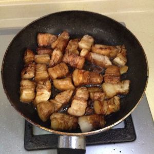 用煎鹌鹑蛋剩下的一点油将冰糖用小火炒成焦糖色,将焯好毙干水份的肉块倒入锅中,将肉块在锅中与焦糖翻炒均匀上色