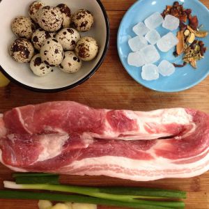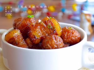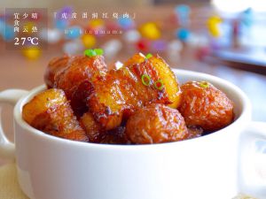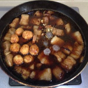 肉上色后倒入酱油翻炒,酱油一定要在锅中炒一下,这样颜色才会红亮,不要加水后在倒入酱油,再虎皮蛋,香叶、桂皮、葱姜倒入锅中一同翻炒均匀后倒入开水没过所有食材盖上锅盖,用中小火焖煮半小时左右