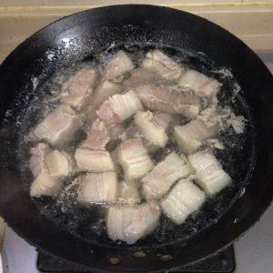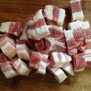 做一锅热水,加少许料酒,水未完全烧开时下入事先切好的五花肉丁焯烫5分钟,去除血沫子后捞出沥干