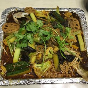 海底捞牛油火锅底料+六月鲜豆瓣酱入锅翻炒,根据需要加入适量水,加入蔬炒至五分熟倒入烤盘,上下火210度再烤十分钟,见到烤盘里汤汁沸腾即可。加入香菜。真的好好次啊!