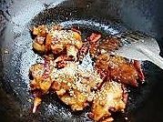 用一炒锅,放冰糖炒糖色,一直炒到糖变成棕红色。放入炖过的猪蹄,翻炒到粘满糖色。再倒入刚才炖猪蹄的汁,大火收汁,盛出备用。(用铲子翻动下,免得炒糊。)