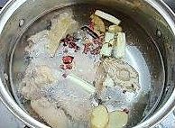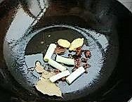 锅内放一小勺油,冷油放葱、姜、蒜、花椒、香叶、茴香并炒出香味。