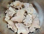猪蹄洗净切块,放锅里煮开,煮10分钟。煮好的猪蹄用冷水冲洗干净,沥干水分。