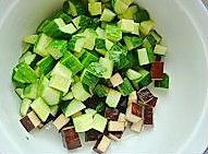 将黄瓜、熏干、香菜加 入花生中,加盐、生抽、陈醋、细砂糖、香油拌匀即可(最好要吃的时侯再拌。否则被酱汁泡久了就不脆了)。