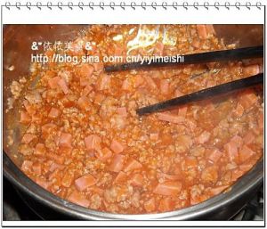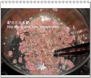 热油锅,放进肉末和火腿粒翻炒,肉末已经用盐腌过,不用再放盐: