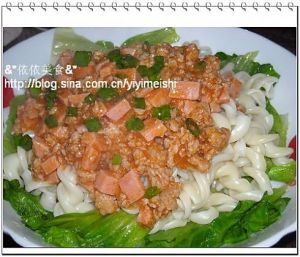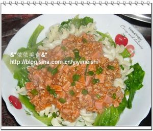 把煮好的肉末淋上意粉上面,撒上葱花就可以啦:
