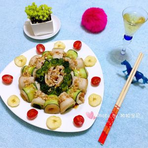 黄瓜片和猪五花肉片卷起来交叉摆入盘中