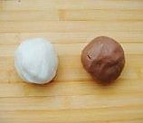 将糯米粉加入糖和160克温水和成光滑的白色面团,分成两份,另一份加入可可粉以及少许温水和成光滑的巧克力面团。
