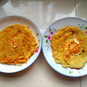 在做一个不放鸡蛋的,尽量把土豆浆糊摊均匀,摊成圆形。煎至两面金黄后出锅。