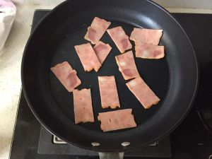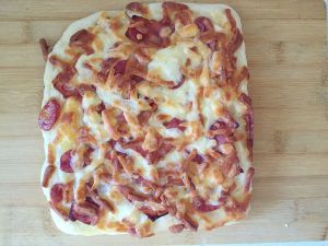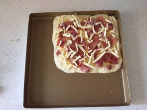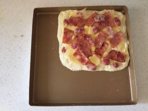 饼皮上放入土豆片一层,培根铺上,香肠铺上(香肠是提前蒸熟过的)