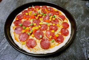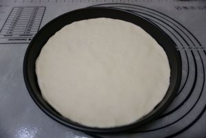 取其中一个面团放在披萨烤盘上,然后用手将面团向烤盘的四周按压做饼底