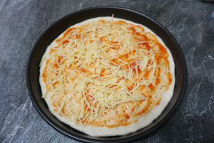 先均匀的涂抹一层披萨酱,再撒一层马苏里拉奶酪