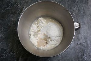 首先在搅拌盆中加入分别称好面粉,酵母,水,植物油,糖和盐