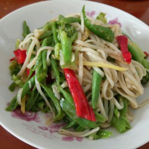 锅热后,先放入豆角,西兰花,青、红辣椒炒好,然后加入面条加些生抽,盐翻炒一会儿,入味后出锅装盘。