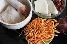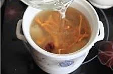 把鸡肉连带焯鸡肉的水一起倒入炖盅内,加入红枣,椰子肉,虫草花,
