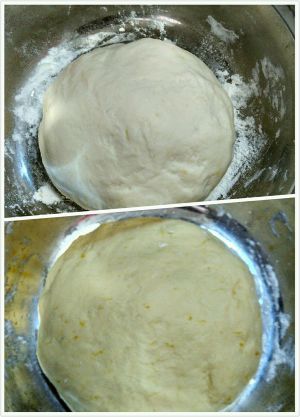 双色面团准备好,为了缩短发酵时间,我们分别将面团过压面机。