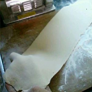 面团太大可以切开两边,每个面团用最大档位压五次即可。不用压得太细。没有压面机可以借助擀面棍