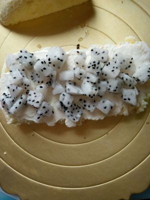 把蛋糕分成三份,一大两小,大的切两层,摸上奶油,放上水果