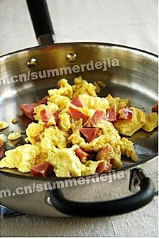 把火腿丁放入鸡蛋中,锅中放适量食用油,油热后倒入鸡蛋炒散;