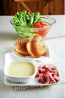 生菜和西红柿洗净,用淡盐水浸泡几分钟,鸡蛋加盐、胡椒粉打散,火腿切丁;