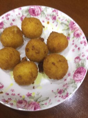 挖一点土豆泥 搓成小丸子,中间用手指压一个洞把马苏里拉芝士填在里面。再把它合起来。
