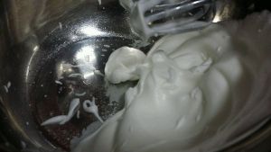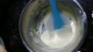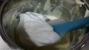 混合余下的材料成蛋白糊,注意速度轻快不要过度搅拌。
