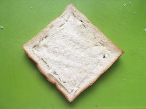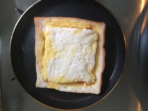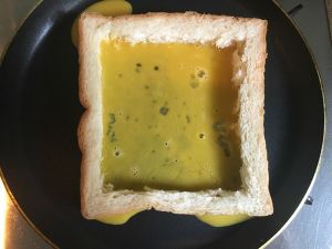 迅速把切下来的吐司片盖回去,沿着缝隙把剩余的鸡蛋液倒入