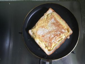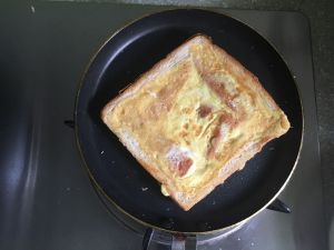 用锅铲轻轻的压一压吐司片,然后翻个面,可以看到颜色已经金黄金黄的了,如果喜欢吃焦一点的就再等30秒再翻面。
