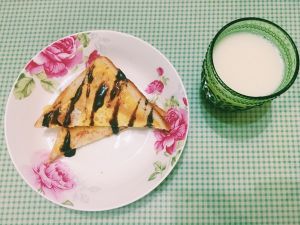 淋上巧克力味的炼乳,再配上一杯鲜榨的豆浆,早餐开吃~