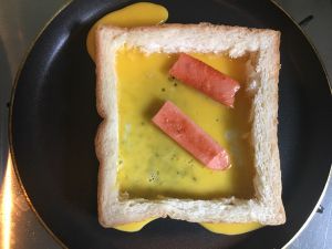 将一片吐司摆在案板上,用刀沿着面包边内侧1cm左右的位置划一个方框,取出中间的面包片,鸡蛋打散,火腿肠切半,用量是一个三明治用一片吐司加一个鸡蛋加半根火腿肠(或者一片午餐肉)