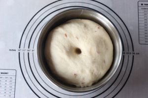 取出揉好的面团,放置温暖湿润处发酵至两倍大,用手指沾面粉轻轻的扎个洞,面团不塌陷不回缩即可。