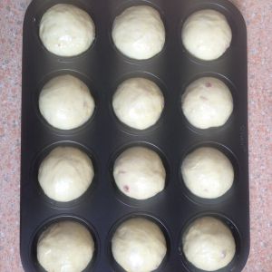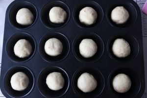 取出面团,排气,等分成12份,揉圆,盖保鲜膜静置10分钟。