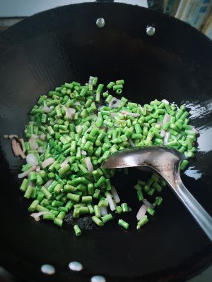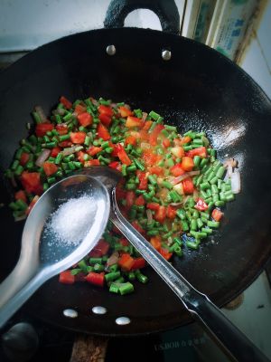 炒至差不多豇豆快熟时加水(根据个人喜好加入适量水,喜欢汤多就多加水),这里可以尝一下盐味