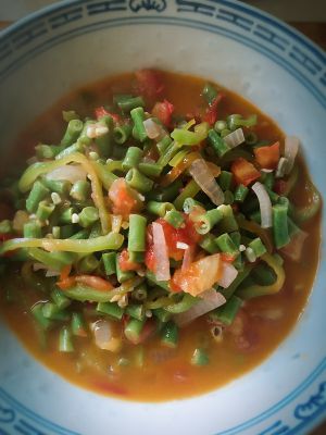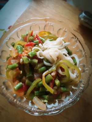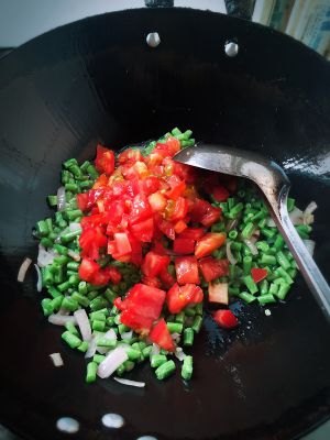 豇豆切丁,洋葱切条,辣椒切条切丁都可,西红柿切丁备用