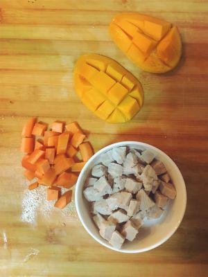各种食材,想办法切丁哈!肌肉,不对,是鸡肉要用开水煮一下,去血沫,看出来备用!