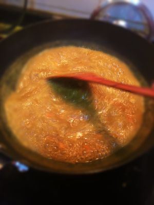 考验耐心的时候到了!要一直顺时针搅拌,慢一点,这样做是怕粘锅底,会糊!直到熬到你想要的状态为止!想吃盖饭的就多留些汁,想要它变成菜的,就多熬一下收汁!