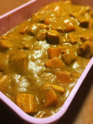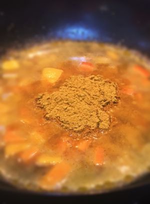 放水,超过食材一点点就行!水开了放两勺咖喱粉,搅匀!放入盐,黑胡椒碎!等着沸腾之后,开小火慢炖十分钟。