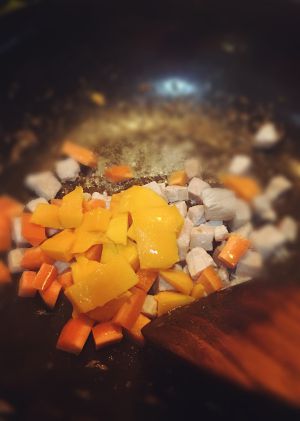 锅中放入少量油,想吃的健康点儿就用橄榄油,想吃的香一点儿,就用黄油!穷屌丝就用玉米油,我就用的玉米油!把所有食材放入热油锅里翻炒两分钟!
