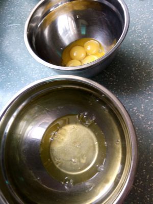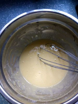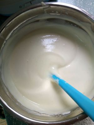 蛋黄发散放玉米油同砂糖同牛奶同盐筛入低筋粉混合无粉粒成蛋黄糊