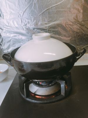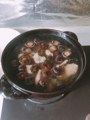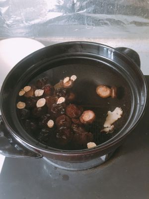 同时在砂锅里放上水、当归黄芪和香菇,开火煮,等到水开了之后放入鸡肉。