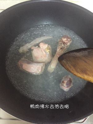 将鸭肉放入沸水中氽烫,去除油脂杂质腥味,也可选排骨、猪骨头、鸡、鸽子、甲鱼替代,捞起沥水。