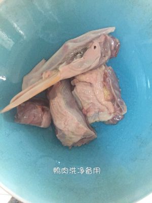 洗干净鸭肉备用,生姜切几片去腥。
