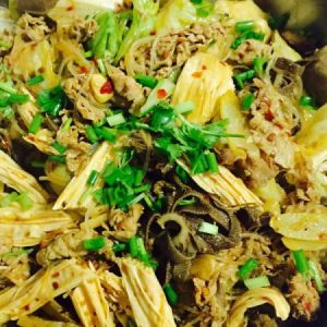 料炒香后,先放入肉和丸子一类的,炒一会,再放入青笋和腐竹,然后放入粉丝,最后放生菜,就一直炒就行,都炒均匀,可以加一些海鲜酱油。