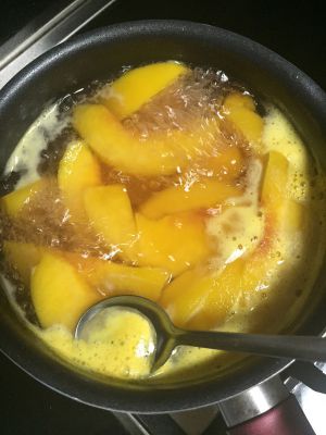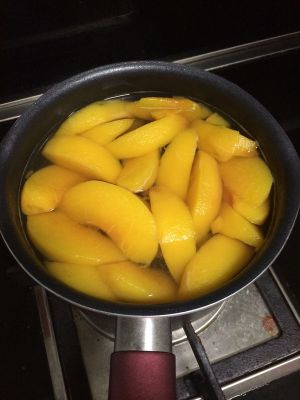 黄桃、冰糖、水放入奶锅,开大火煮。
