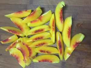 去核、切块(看看,我的黄桃都是红心❤的哦)。