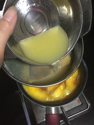 将柠檬汁倒入奶锅,最好过下筛。