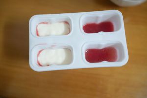 准备冰棍模具倒7分满;放冰箱冻1小时取出加一层酸奶,就是西瓜白色部分了,要是原味酸奶要加点白砂糖