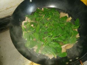 关完火事先洗好的菠菜放入汤中,小菠菜可以直接烫熟,不需要在煮一遍,此时加入盐,味精少许,在倒入少许的食用油,一层油漂在汤上很好看的
