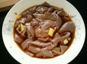 泡好的猪肝,倒入料酒,食用盐,生姜,腌制半小时,猪肝这样比较入味