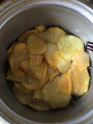 芋头片准备好后 在锅里倒入油 油适量能炸芋片即可 烧至7。 8分热 筷子放里起泡就可以 小火 放芋片了 一次不要放太多 炸时不要老是搅动 一会翻下面就行 炸到变色 有点硬就可以捞起了